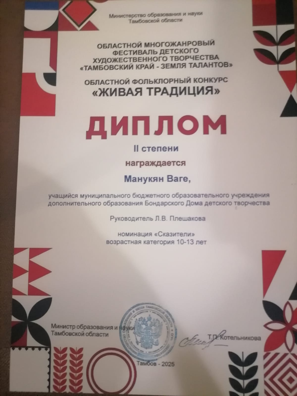 Среди победителей конкурса, в номинации «Сказители,» возрастная категория 10-13 лет обучающийся детского объединения «Волшебный мир театра» Манукян Ваге с призовым вторым местом.