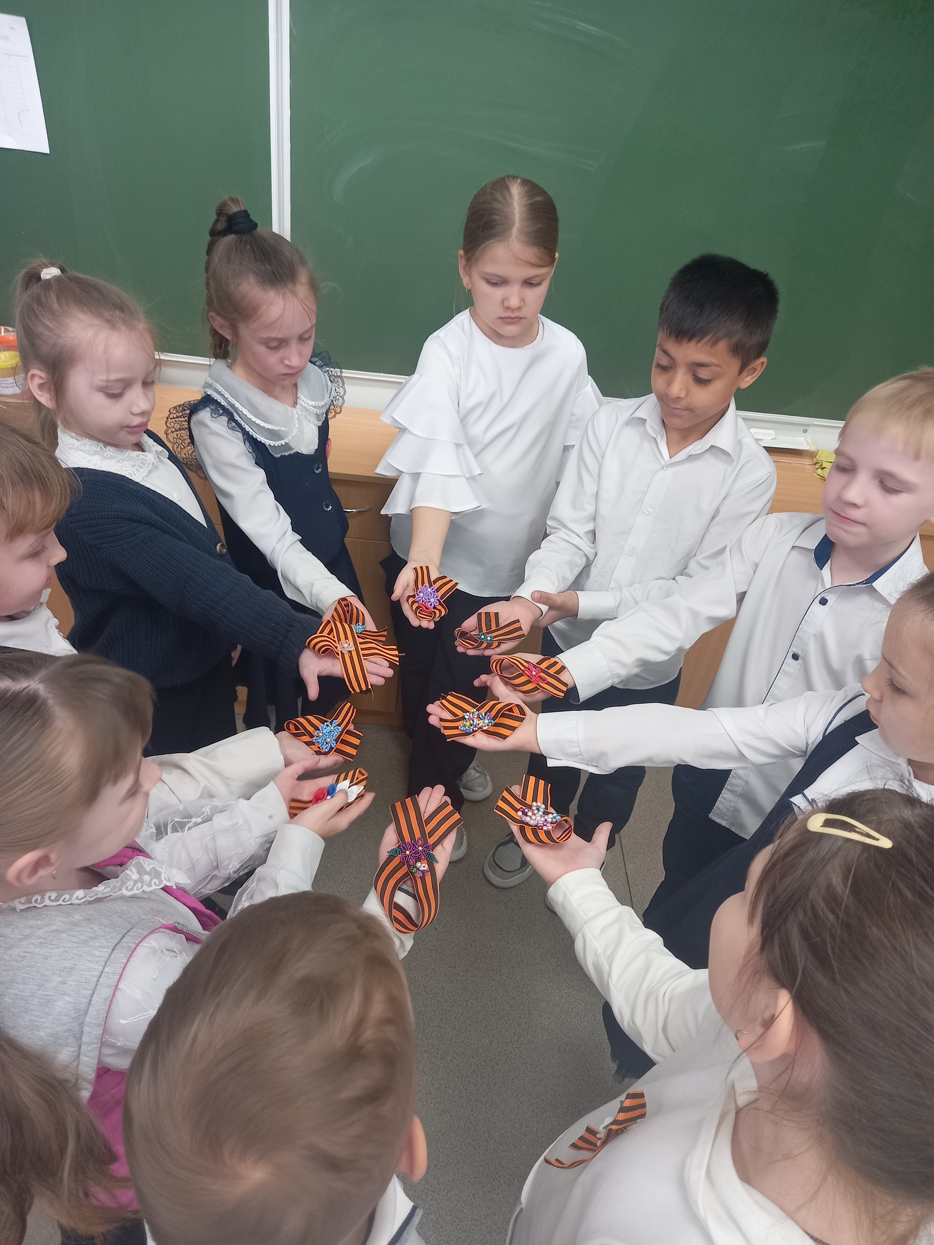 Занятие в д/о «Бисероплетение» накануне 9 мая было необычно торжественным и интересным. Дети трудились с прилежанием над украшением георгиевской ленты и с вниманием слушали педагога Татьяну Аппоротову. А рассказывала она о том, что лента возникла в 1769 году, когда императрица Екатерина II утвердила орден Святого Георгия. Этот знак отличия вручали офицерам за подвиги в Русско-турецкой войне. Награду следовало носить на полосатой ленте государственных цветов — чёрного и жёлтого. По названию ордена она получила имя георгиевской.