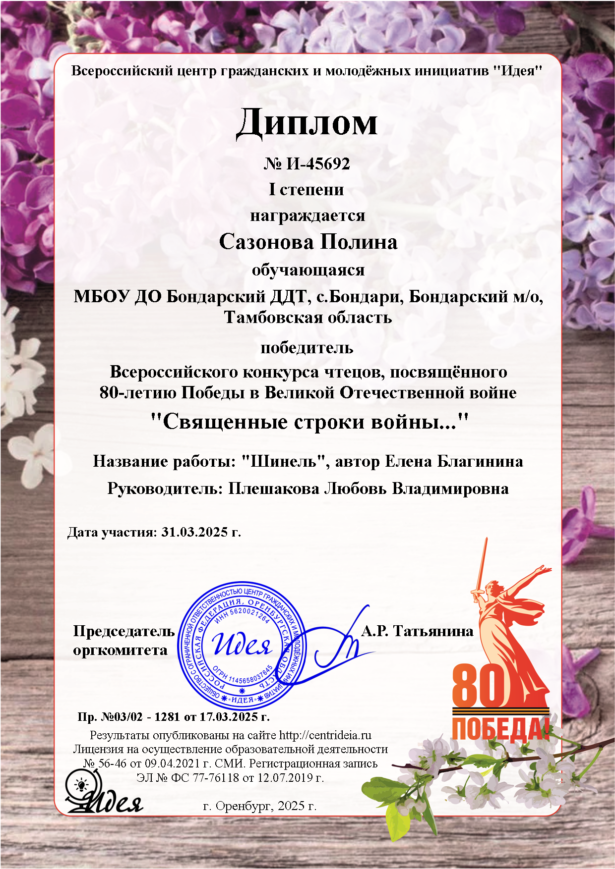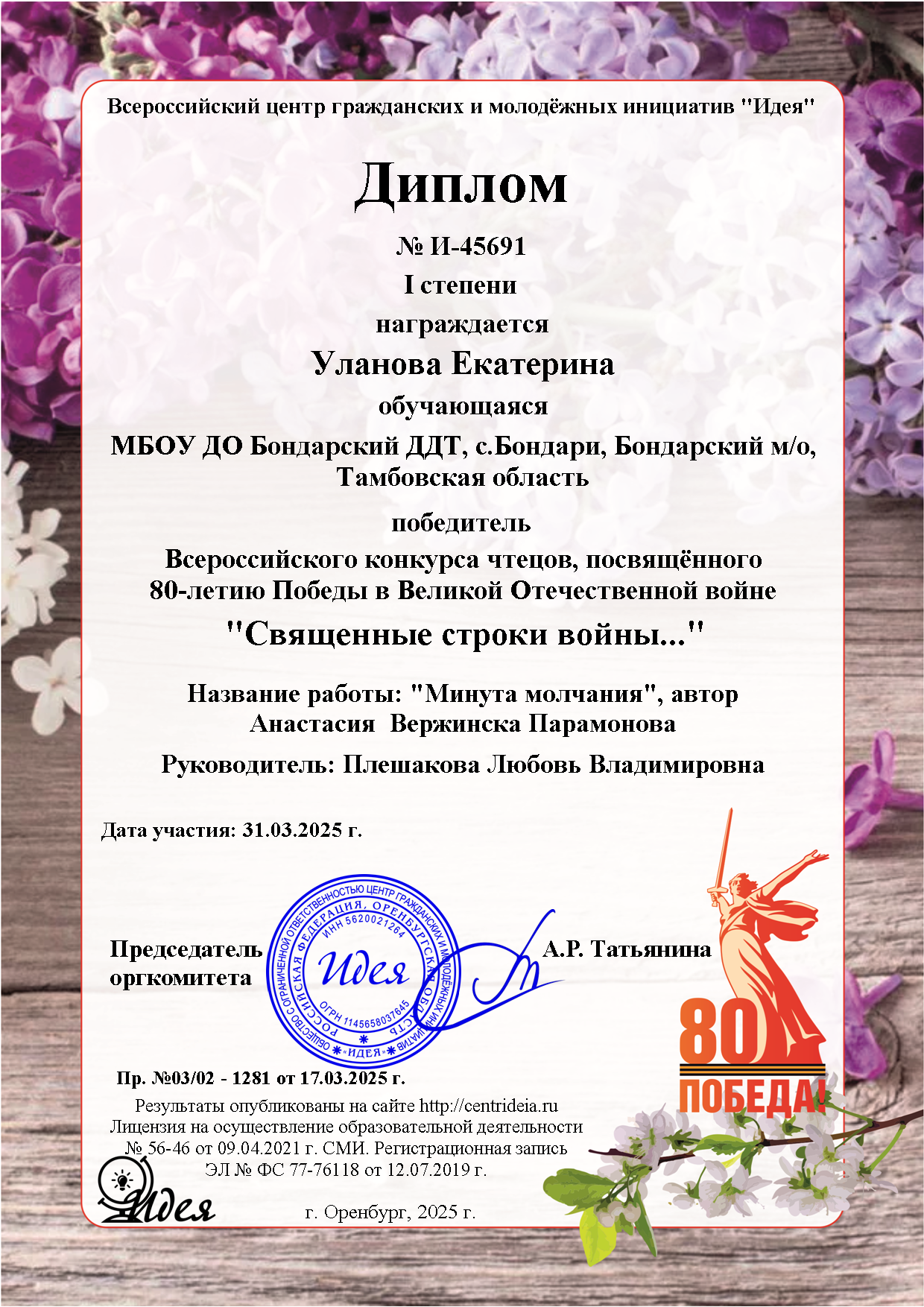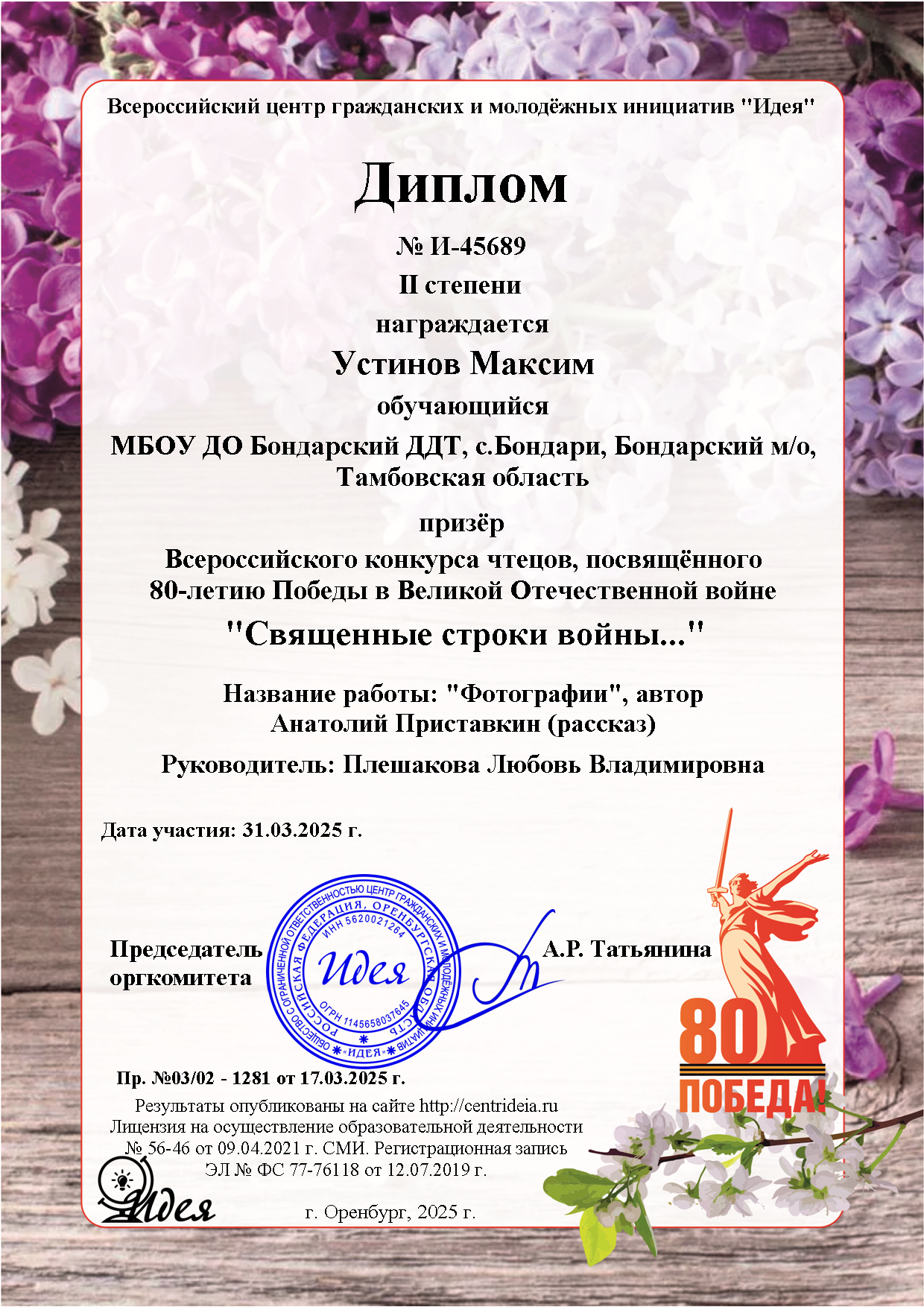 21Май 2025 Священные строки войны… by user ⋅ Leave a Comment Результат участия обучающихся д/о «Теремок», «Перевоплощение»,»Волшебный мир театра» во Всероссийском конкурсе чтецов, посвященном 80-летию Победы в Великой Отечественной войне «Священные строки войны…» Posted in: Новости